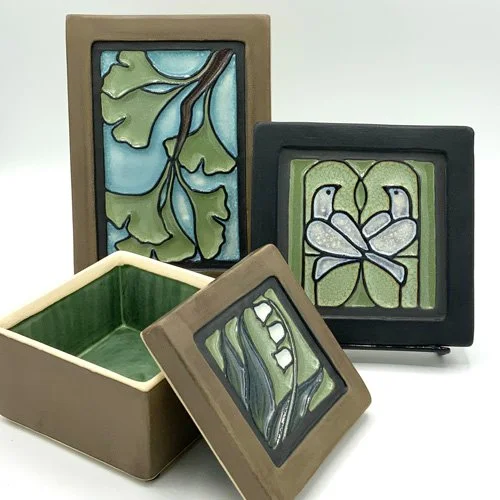 Jennifer crafts hand-pressed limited edition art tiles and slab-built ceramic boxes using stoneware clay. Her original designs are inspired from the beauty of stained glass, the wonders of nature, the timeless allure of the arts & crafts movement era, and the graceful, organic lines that flow through art nouveau. With great care, she handpaints each piece incorporating both matte and glossy midfire glazes to achieve a stained glass effect. She layers glazes within her intricate designs to create depth, richness, and unique characteristics.