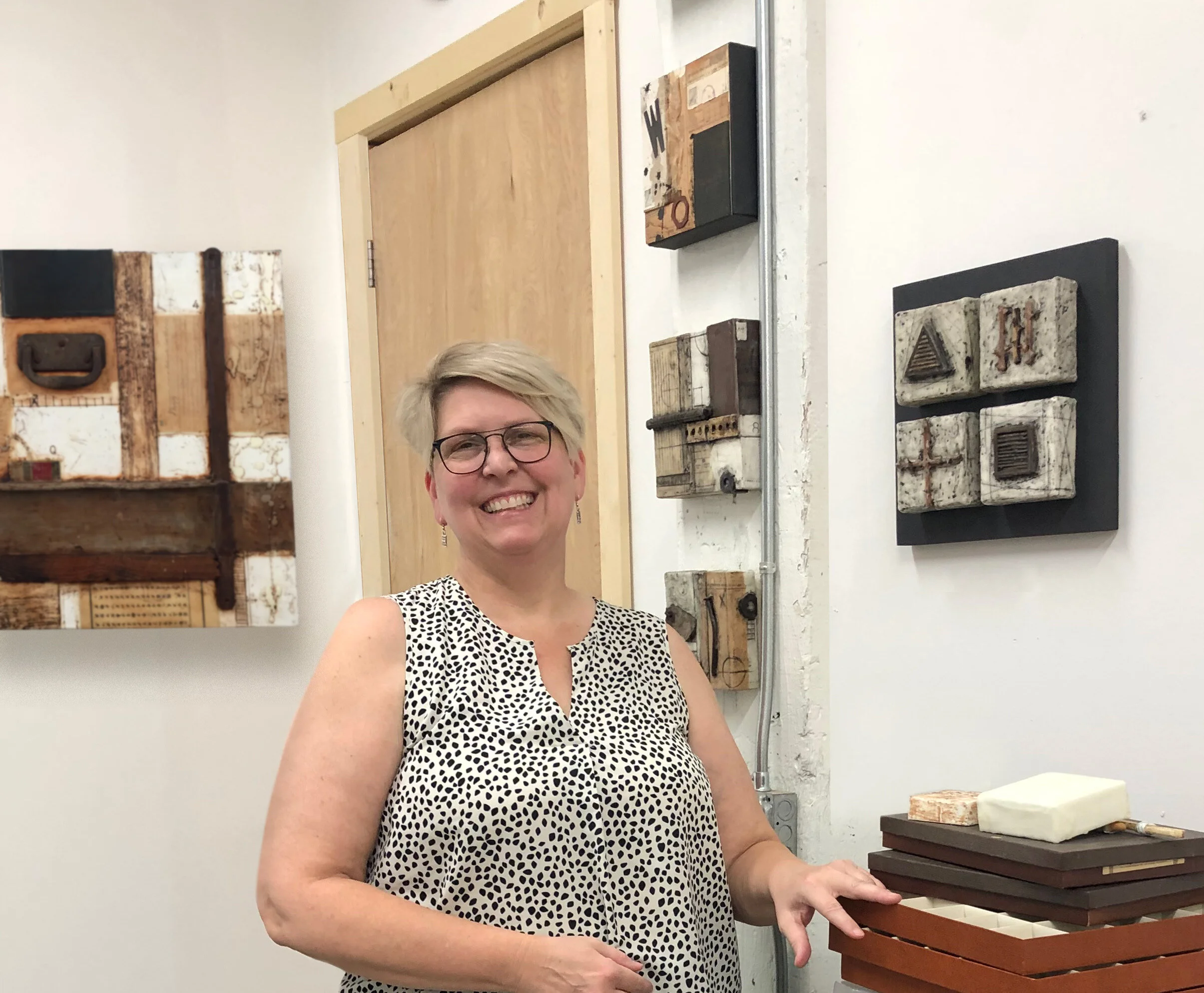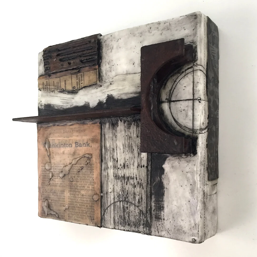 She finds inspiration from vintage ephemera and rusted metal. Creating beauty with the worn and rusty, the disused and discarded. Her work is made through the collage method of building up layers of encaustic medium, incorporating found objects and adding meaning to pieces through incising and painting. Her rural upbringing gave her an appreciation for hardworking people and the objects that helped them do their work, now and in the past. Her work honors and celebrates these people.
